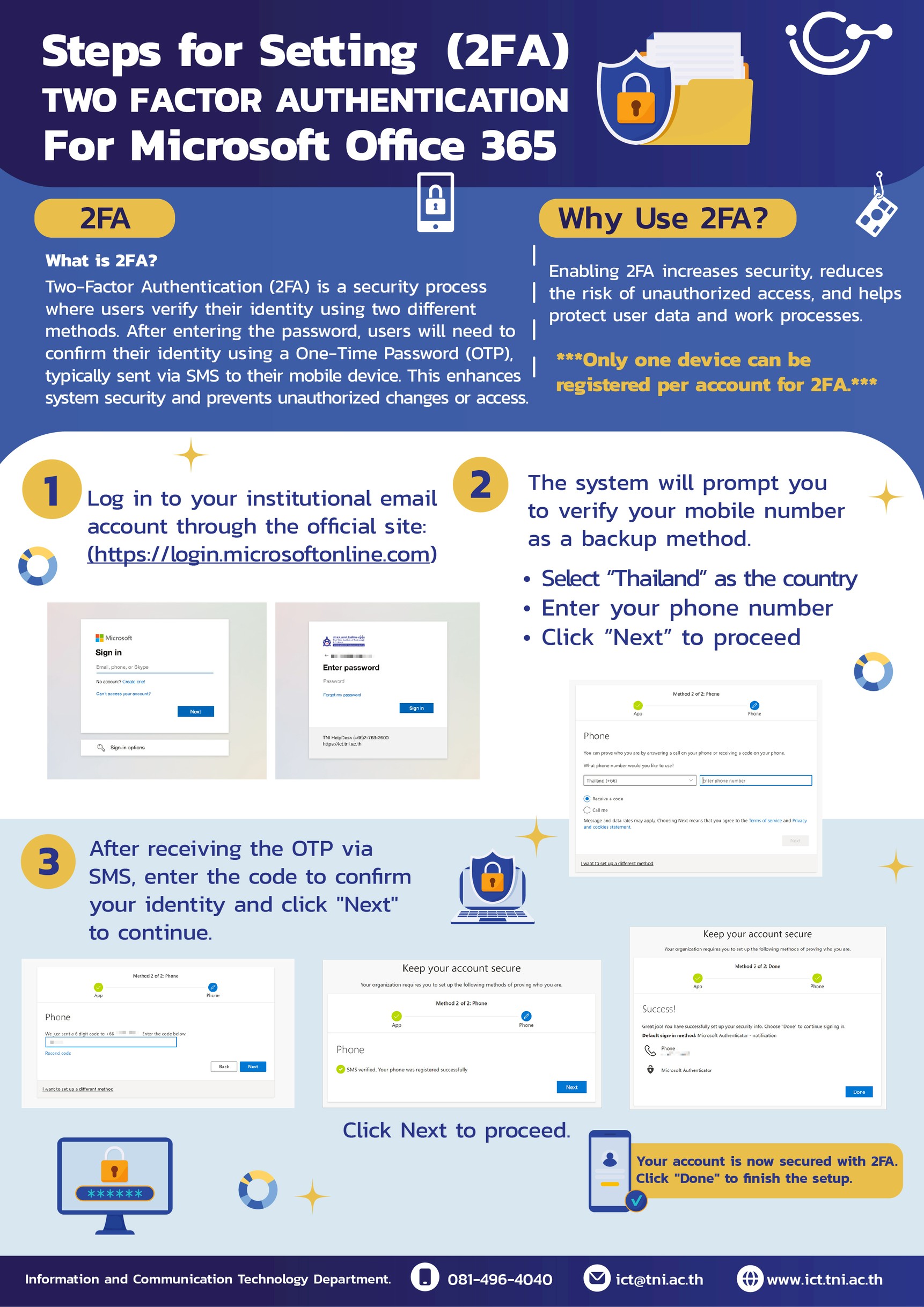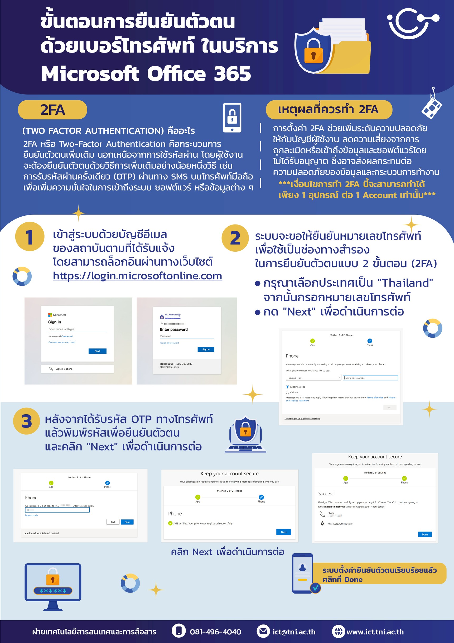 By adminPosted on 16 July 2024Posted in ICT Manual การยืนยันตัวตนแบบ 2 ขั้นตอนในบริการ Microsoft Office 365 Dowload คู่มือการตั้งค่าการยืนยันตัวตนแบบ 2 ขั้นตอน ภาษาไทย / ภาษาอังกฤษ Download Steps for Setting Up Two-Factor Authentication (2FA) for Microsoft Office 365 How to set up 2 Step Verification Post navigation ประกาศยุติบัญชีและลบข้อมูลของศิษย์เก่า (Discontinuation of Alumni service)เชิญชวนใช้งาน Microsoft Team เพื่อการจัดการเรียนการสอนออนไลน์ที่สะดวกสบายยิ่งขึ้น !! Scroll to top