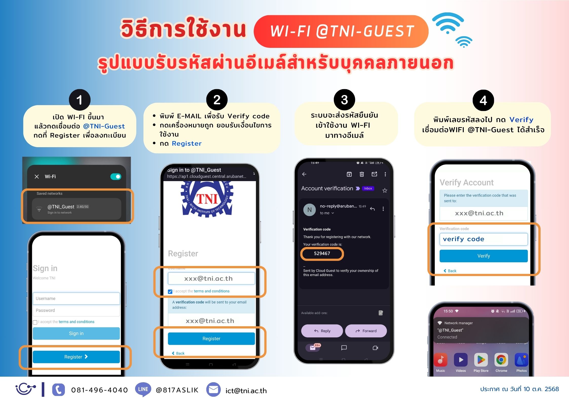 แจ้งเปลี่ยนวิธีรับรหัสยืนยันใช้งาน Wi-Fi @TNI-Guest สำหรับบุคคลภายนอกจาก SMS เป็น E-MAIL ชั่วคราว