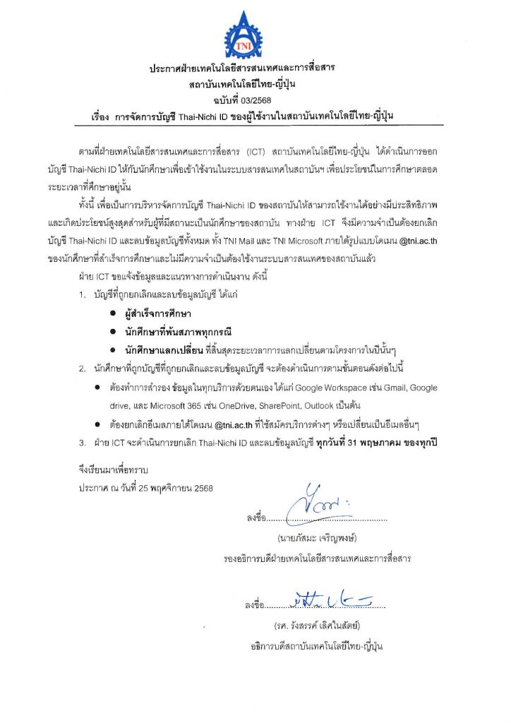 อ้างอิงตามประกาศฝ่ายเทคโนโลยีสารสนเทศและการสื่อสาร สถาบันเทคโนโลยีไทย-ญี่ปุ่น ฉบับที่ 03/2568เรื่อง การจัดการบัญชี Thai-Nichi ID ของผู้ใช้งานในสถาบันเทคโนโลยีไทย-ญี่ปุ่น